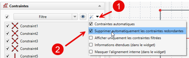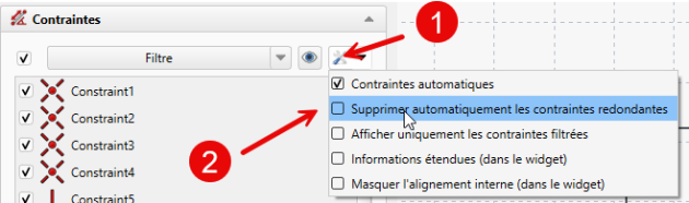 - Cliquer sur le bouton déroulant  du panneau du panneau- Contrainteset décocher la case- Supprimer automatiquement les contraintes redondantes; - Suppression automatique des contraintes redondantes désactivée