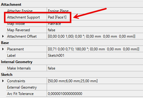 En choisissant la face verticale pour créer l’esquisse, FreeCAD a attaché l’esquisse à cette face : Pad [Face1] ;